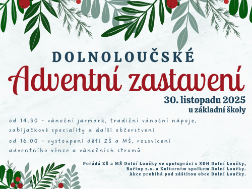 Zastavte se první adventní neděli u základní školy v Dolních Loučkách a užijte si předvánoční atmosféru na vánočním jarmarku, ochutnáním tradičních vánočních nápojů, zabíjačkových specialit, palačinek a mnohého dalšího. Těšit se též můžete na vystoupení dětí ZŠ a MŠ zakončené rozsvícením vánočních stromů.