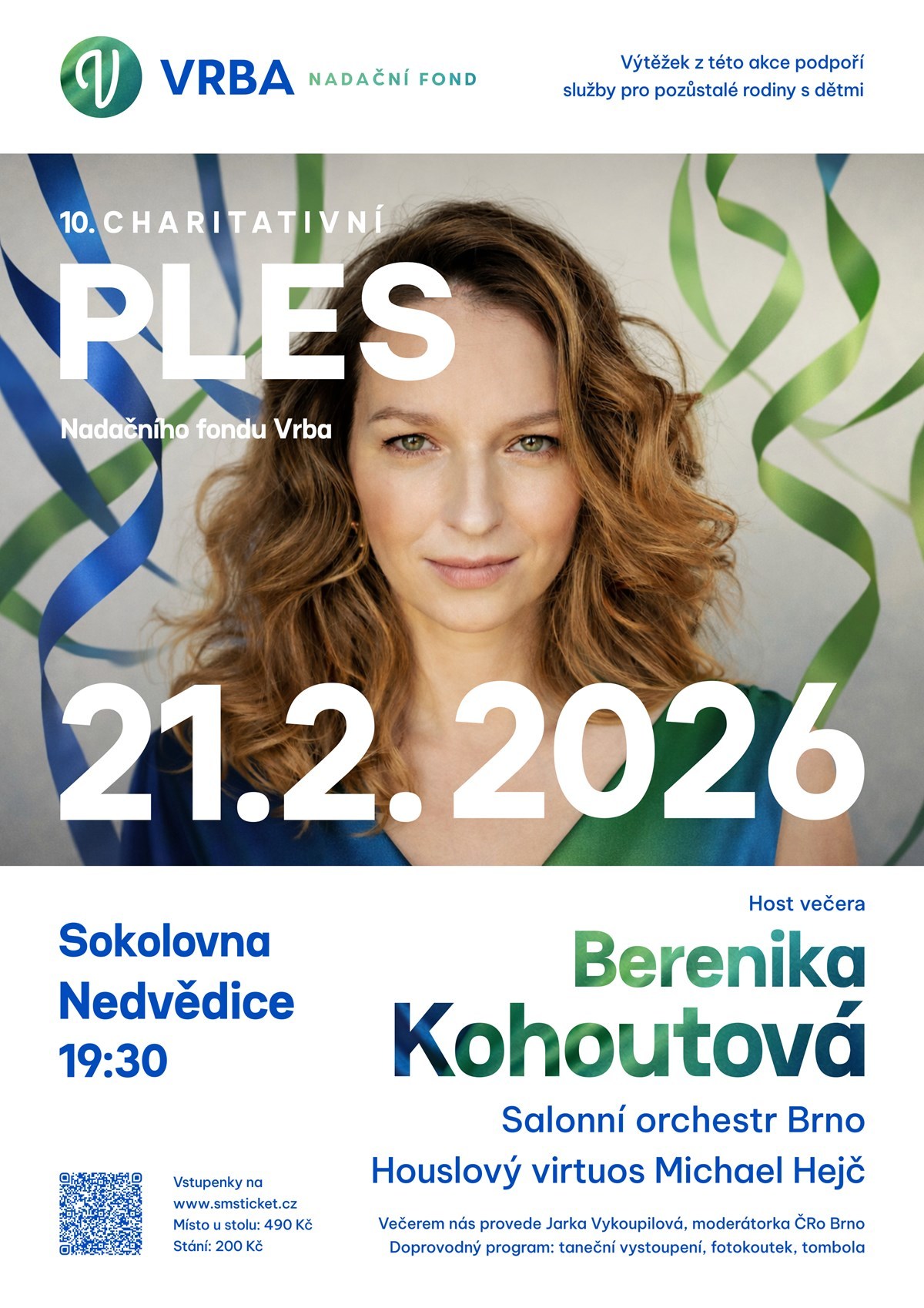 Zveme vás na jubilejní 10. charitativní ples Nadačního fondu Vrba, který se uskuteční v sobotu 21. února 2026 od 19:30 v Sokolovně v Nedvědici u Brna.
