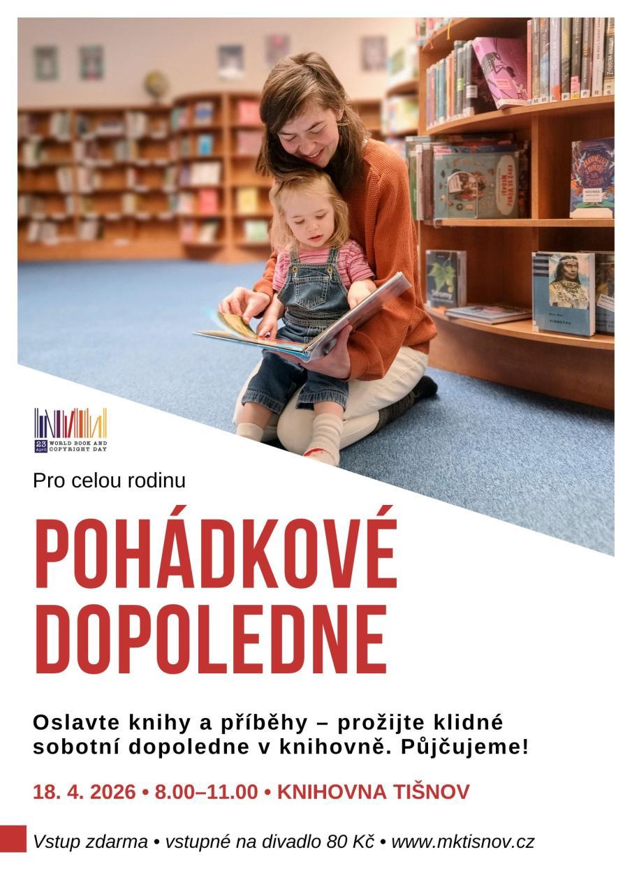 8:00 - 11:00 akce pro děti Městská knihovna Tišnov bez vstupného - Knihovnu otevíráme u příležitosti Světového dne knihy a autorských práv (23. dubna), který je tou nejdůležitější literární oslavou v dubnu – krom toho, že připomíná výročí úmrtí velikánů literatury Miguela de Cervantese a Williama Shakespeara, má za svůj cíl propagovat knihy jako nástroj vzdělání a kultury.