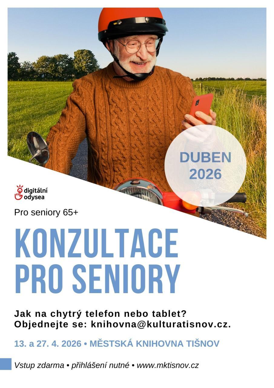 Po 27.04.2026 9:00 - 11:00 individuální konzultace Městská knihovna Tišnov bez vstupného - Poradna pro seniory, kteří potřebují pomoci s ovládáním chytrého telefonu nebo tabletu, s prací na internetu, s e‑mailem či běžnými aplikacemi.
